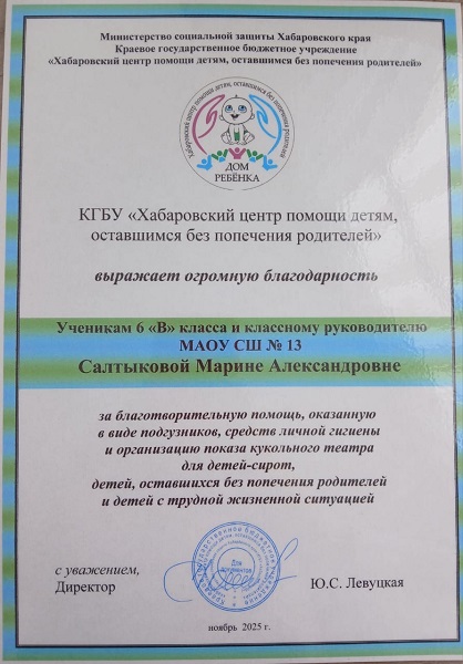 ![]() ![]() ![]() Ученики 6 "В" класса вместе с классным руководителем Салтыковой Мариной Александровной и родителями участвовали в городском благотворительном мероприятии в Доме Малютки. Провели организацию показа, на котором выступил городской Театр Кукол, осуществили материальную помощь для детей-сирот и детей оставшихся без попечительства родителей.