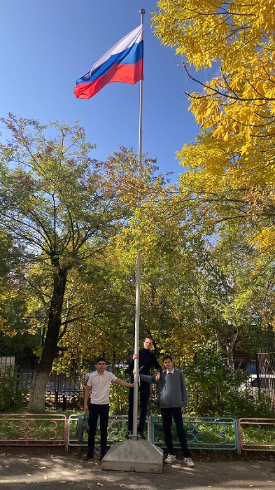 Учащиеся 11 класса вместе с заместителем директора по АХР Андреевым Юрием Александровичем установили флагшток с флагом Российской Федерации на территории школы.